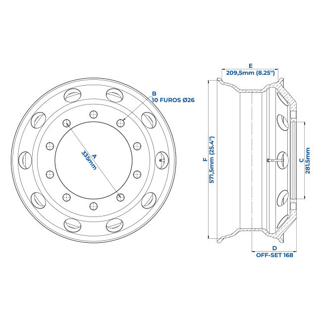 Com dimensões de 8,25 polegadas de largura e 22,5 polegadas de diâmetro, esta roda suporta uma carga máxima impressionante de 3.650 kg, garantindo confiabilidade e segurança em todas as condições de estrada. Pesando apenas 22,5 kg, esta roda de alumínio é significativamente mais leve do que suas contrapartes de aço, contribuindo para uma redução de até 27% na tara do veículo e aumentando a receita do transportador.